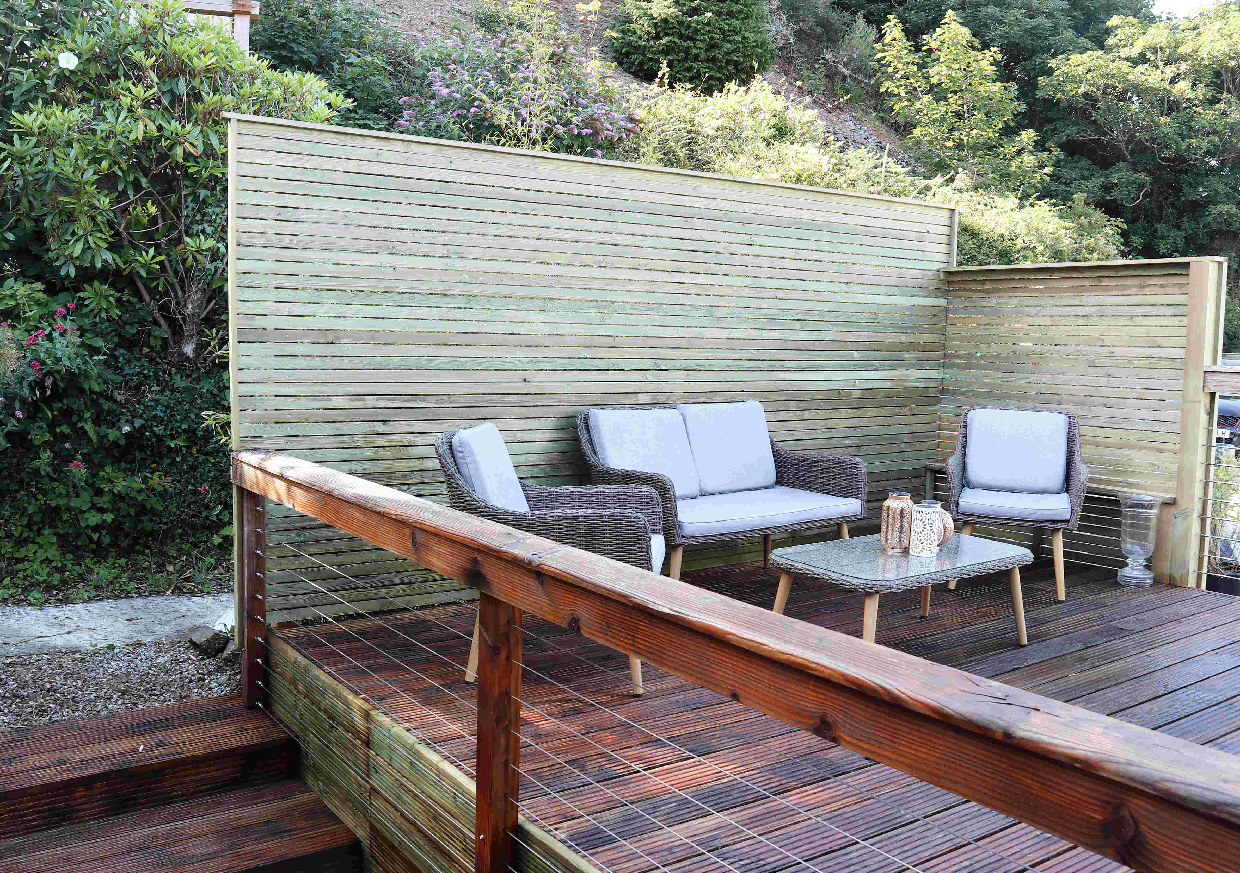 Treth House is the house nearest to the sea and has uninterrupted views. To make the most of the outlook we have designed the living area with two french windows leading out to a large raised decking area.